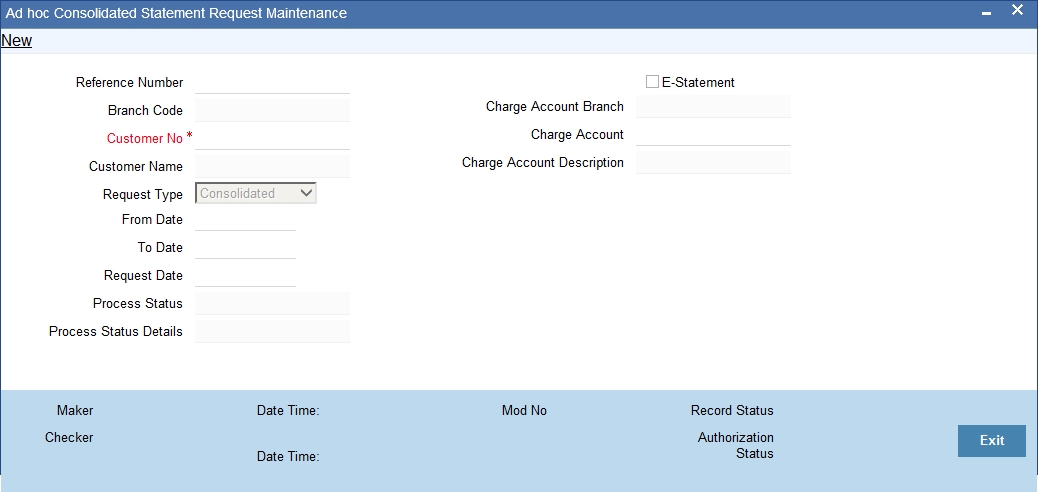 You can maintain ad hoc requests for consolidated statements raised by customers using the ‘Adhoc Consolidated Statement Request Statement’ screen. You can invoke this screen by typing ‘STDCRSMT’ in the field at the top right corner of the Application tool bar and clicking on the adjoining arrow button.