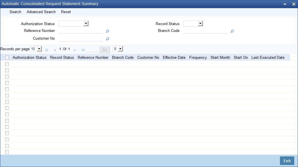You can view a summary of automatic consolidated statement requests using the ‘Automatic Consolidated Request Statement Summary’ screen. You can invoke this screen by typing ‘STSACRST’ in the field at the top right corner of the Application tool bar and clicking the adjoining arrow button.