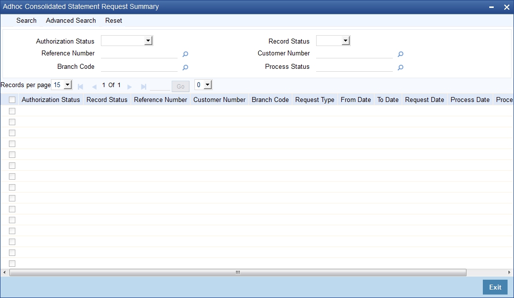 You can view a summary of adhoc consolidated statement requests using the ‘Adhoc Consolidated Statement Request Summary’ screen. You can invoke this screen by typing ‘STSCRSMT’ in the field at the top right corner of the Application tool bar and clicking the adjoining arrow button.