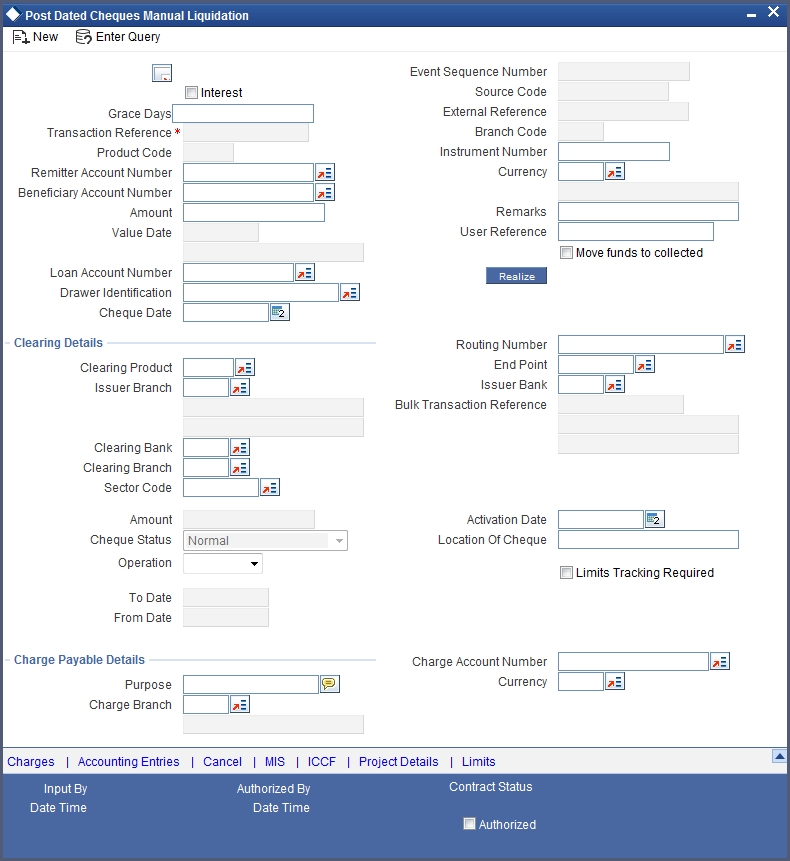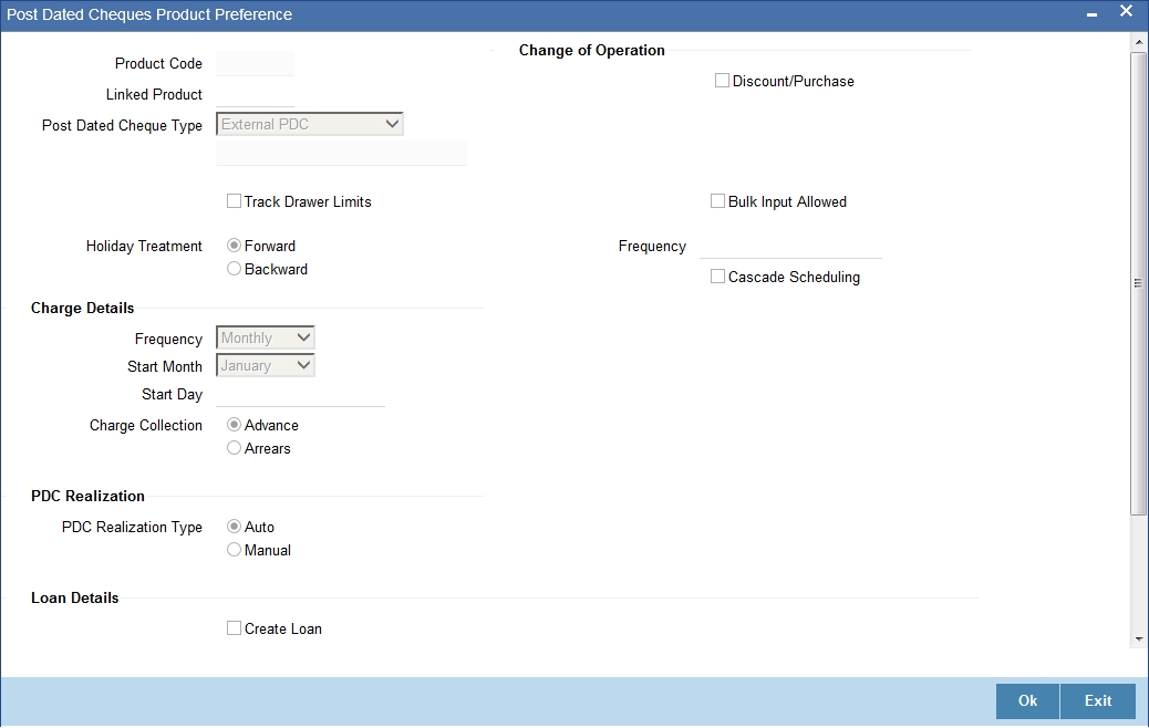 Oracle FLEXCUBE supports processing of post dated Cheques (PDCs) both at Branch and Host levels.