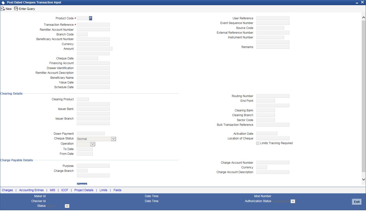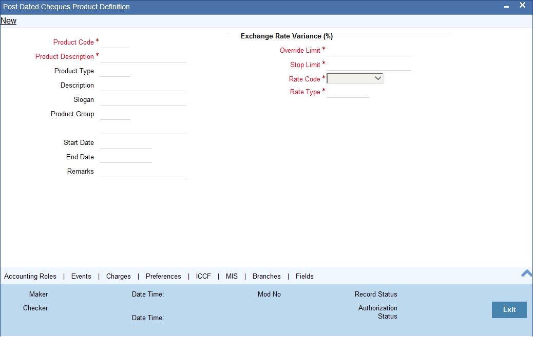 For any product you create in Oracle FLEXCUBE, you can define generic attributes, such as accounting roles, events, MIS details, etc., by clicking on the appropriate icon in the horizontal array of icons in this screen. For a post dated Cheques product, in addition to these generic attributes, you can specifically define other attributes. These attributes are discussed in detail in this section.