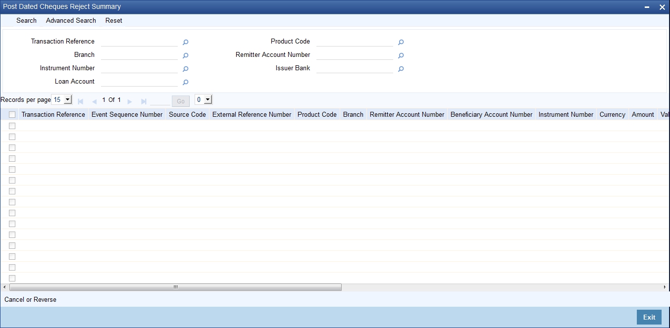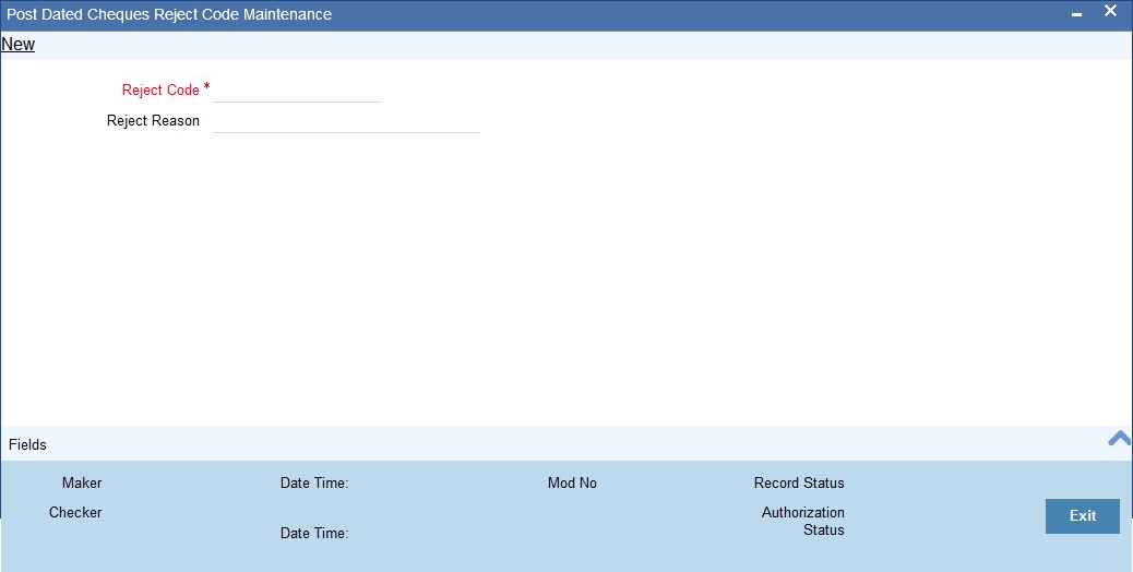 You can maintain reject codes that are applicable to the rejection of post dated cheques using ‘Post Dated Cheque Reject Code Maintenance’ screen. To invoke this screen, type PDDRJCOD’ in the field at the top right corner of the application toolbar and click the adjoining arrow button.