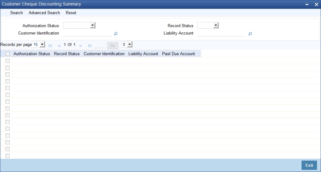 Here, you can query on customer cheque discounting details based on any one or all of the following criteria: