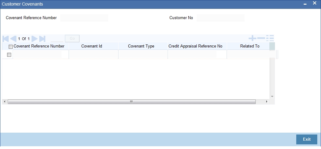 You view the covenants which has been received or pending to receive from the customers through ‘Customer Covenant’ screen.To invoke this screen click ‘Customer Covenants’ button in ‘Receive Covenant Details’ screen.