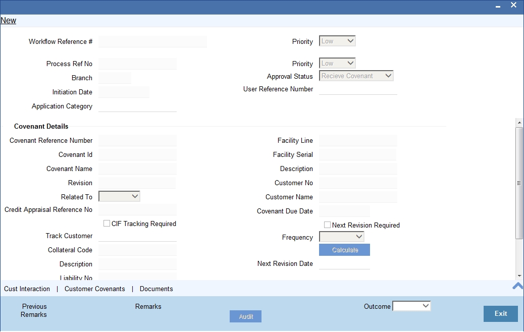 In this stage, the bank receives an application covenant details which will be tracked in the process. Facility will be provided to view the interaction which has been carried out with the customers and list of covenants which are pending / received from the customer.
