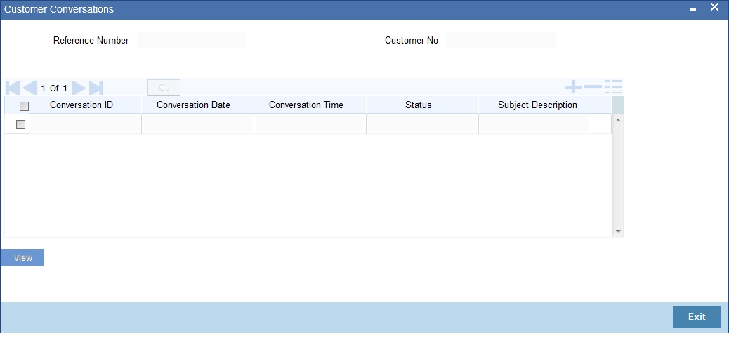 You can view the conversation information for the selected conversation id through ‘Conversation Input’ screen. To invoke this screen click ‘View’ button in the ‘Customer Conversation’ screen.