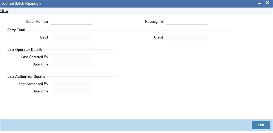 To reassign a batch to a different user click on Jrnl/Teller Batch Op in the Application Browser. Choose Reassign Batch displayed under it. The ‘Batch Reassign’ screen will be displayed.
