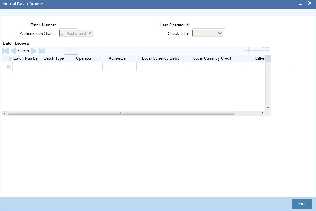 You can upload journal batches into Oracle FLEXCUBE using 'Journal Batch Upload' screen. To invoke the screen, type 'DEDUPONL' in the field at the top right corner of the application toolbar and click the adjoining arrow button.