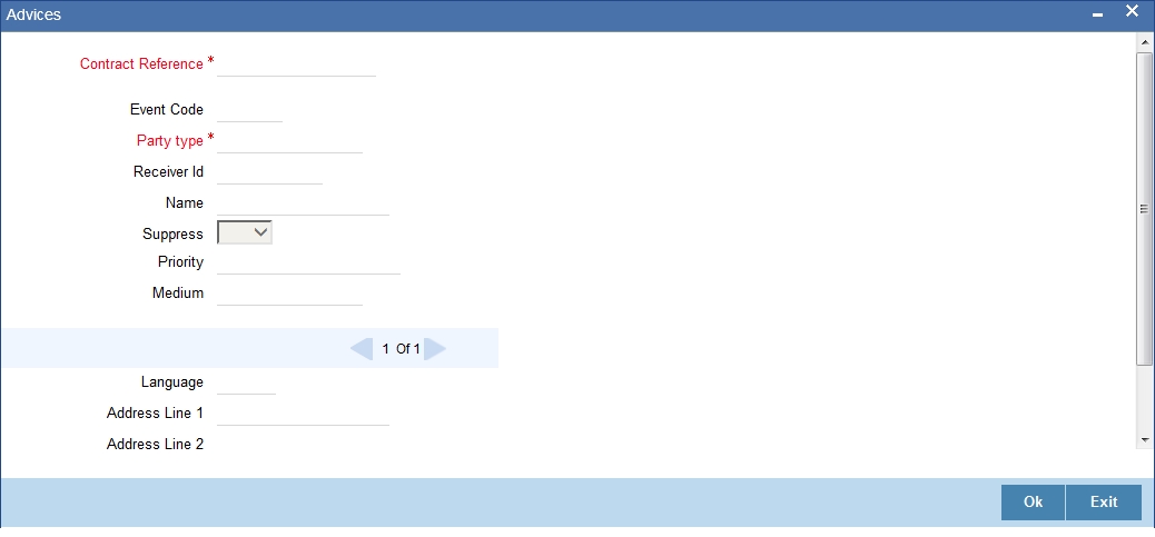 Advice | Click on this button to enter the leg advices. You can view suppress and prioritize the advices that are to be generated for each leg of the transaction. | |||