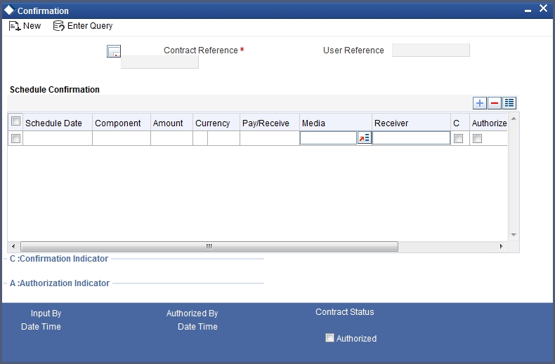 After you authorize the record (the ‘A’ option appears checked), you are not allowed to make any modifications in the ‘Schedule Confirmation’ screen pertaining to a confirmed schedule. If the counter-party confirms another schedule, later on, the above process must be repeated for the relevant schedule.