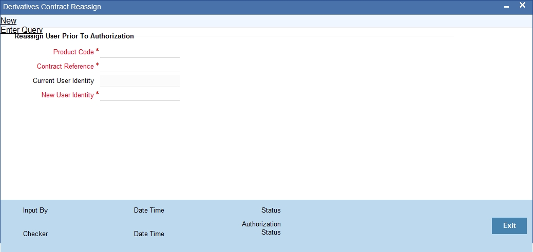 You can invoke the ‘Derivatives Contract Reassign’ screen by typing ‘DVDTREAS’ in the field at the top right corner of the Application tool bar and clicking on the adjoining arrow button.