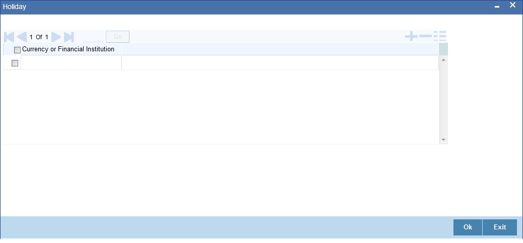 Click ‘Holidays’ button to invoke the ‘Holiday Currency’ screen to indicate the currencies or the financial institutions (depending on your selection of the holiday treatment) involved in the contract. This option is enabled only if you have selected the ‘Combined’ option for the Derivative Type involved in the contract.
