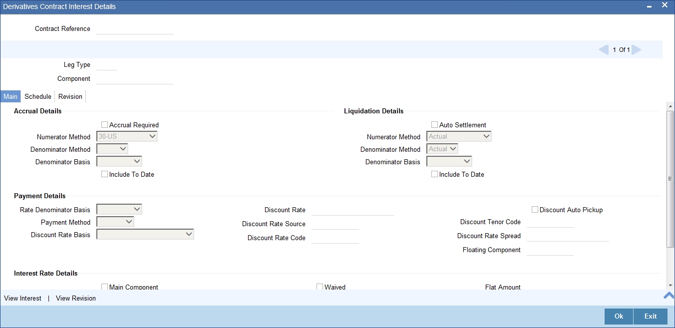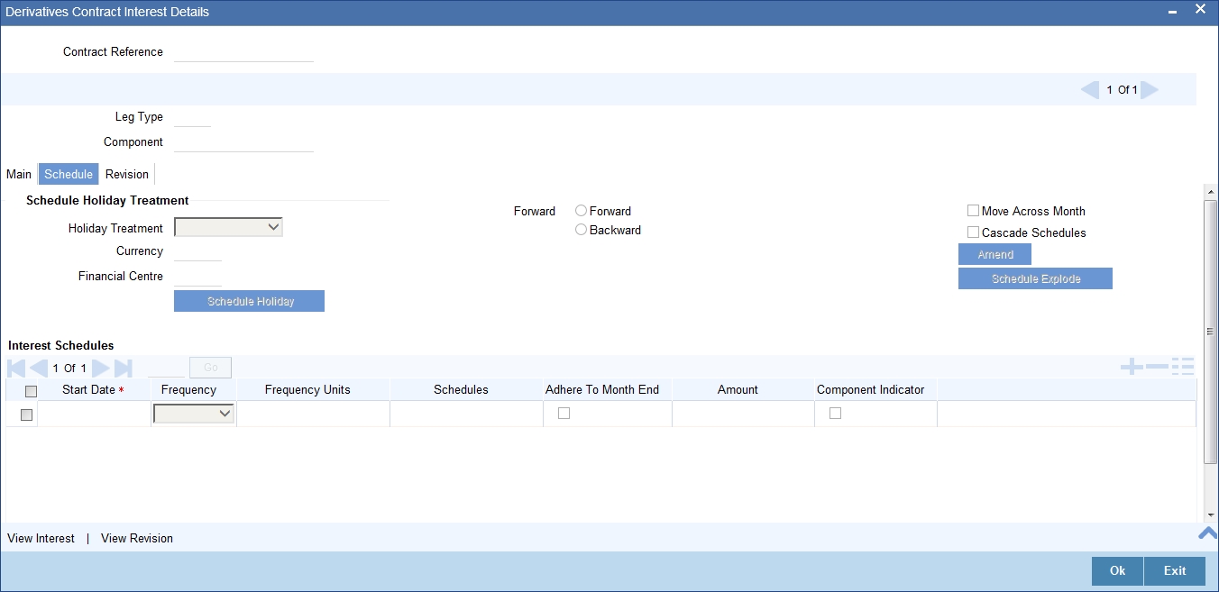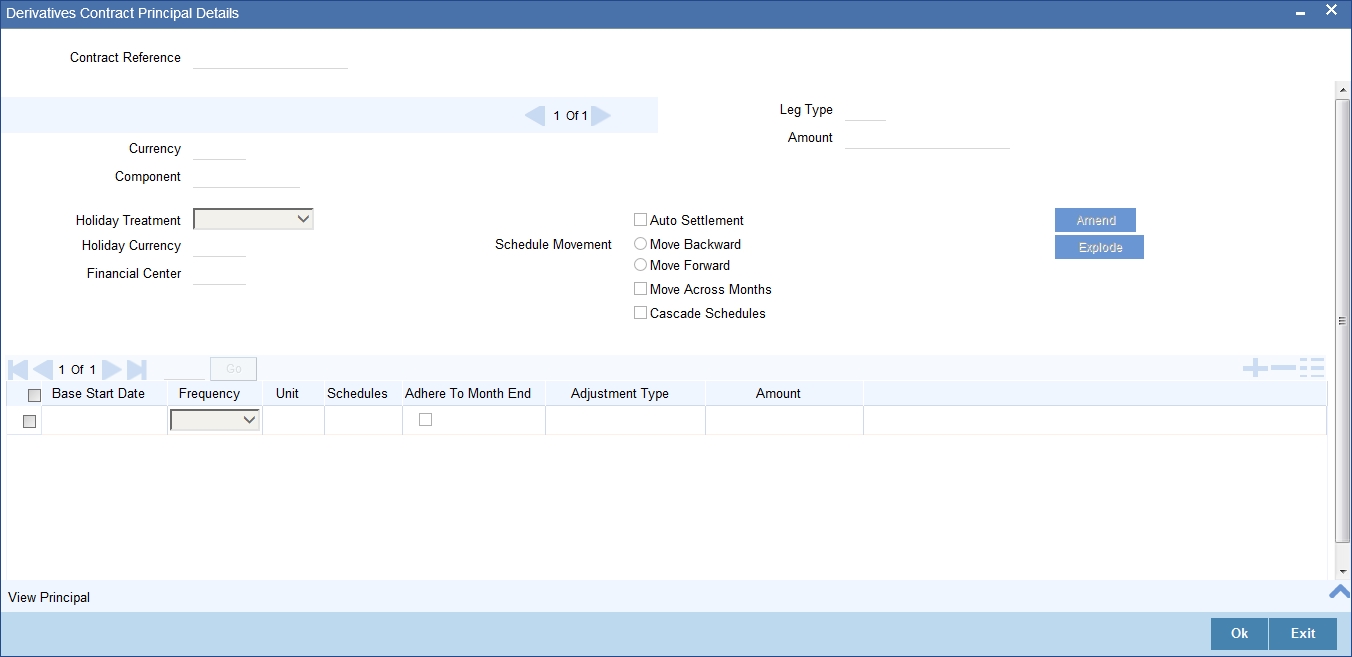 The body of fields, in this screen, is divided into two tabs. Firstly you need to capture the main details of the derivative contract such as the Contract Type, Counterparty and the In and Out Leg interest and principal details. You can specify the Contract Principal Schedules for both the in and out legs separately by clicking ‘Principal’ button. Click ‘Interest’ button to indicate the interest details for both the legs of the contract.