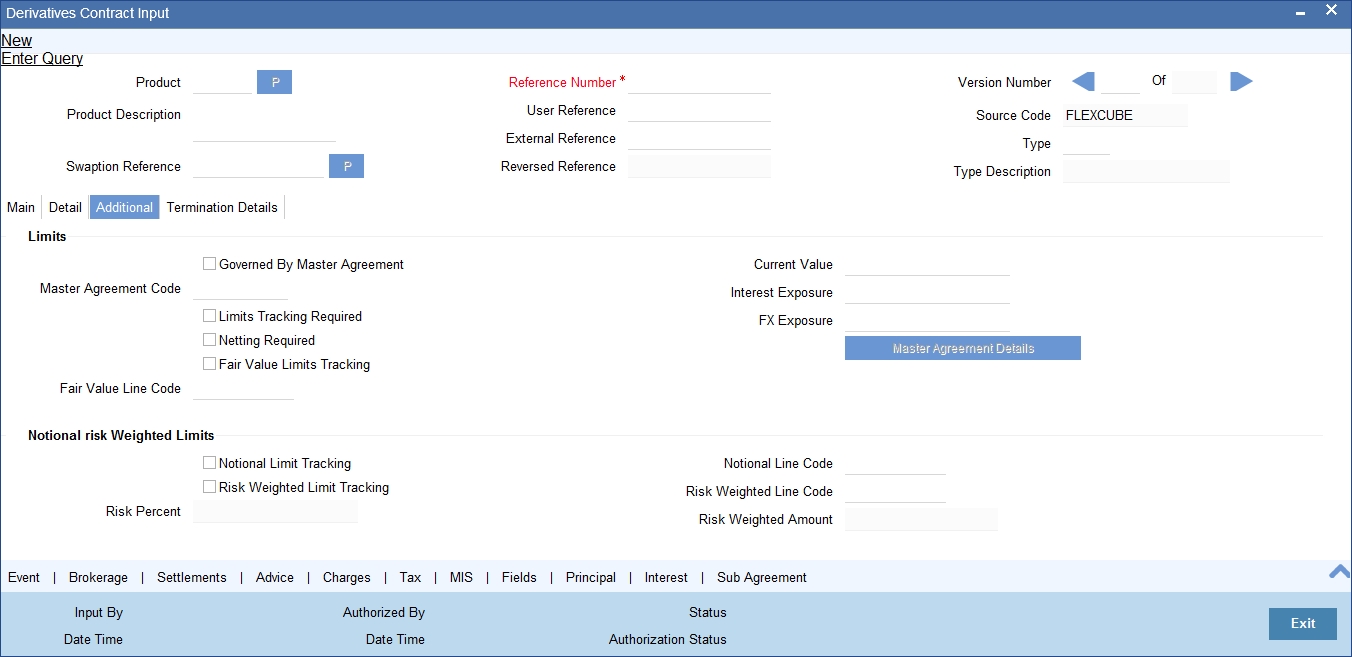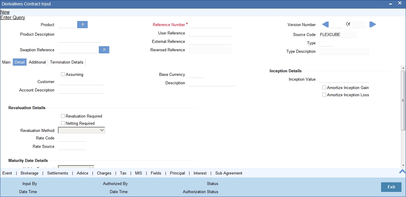 Next you can start capturing additional information relating to the derivative such as the Revaluation details, Inception and Termination details and so on by moving to the Detail tab.