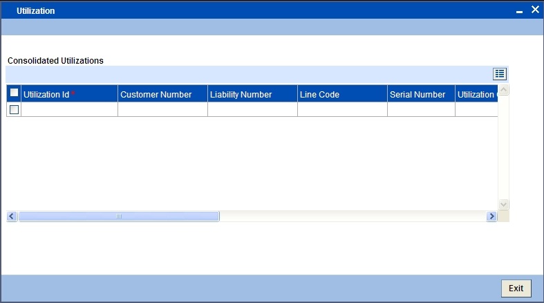 In the ‘Facility Query’ screen, choose the facility for which you wish to view the utilization details by checking the box at the beginning of the row and clicking on the ‘Utilization Details’ button. The system displays the ‘Utilization Query’ screen containing details of the utilization, as shown below: