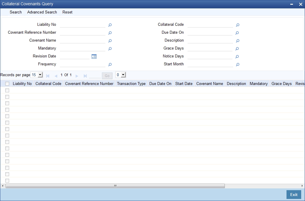 The ‘Collateral Covenants Query’ allows you to query the covenants associated with a particular collateral. Details including the collateral code, liability number, last revision date, notice days for the covenant can be viewed.