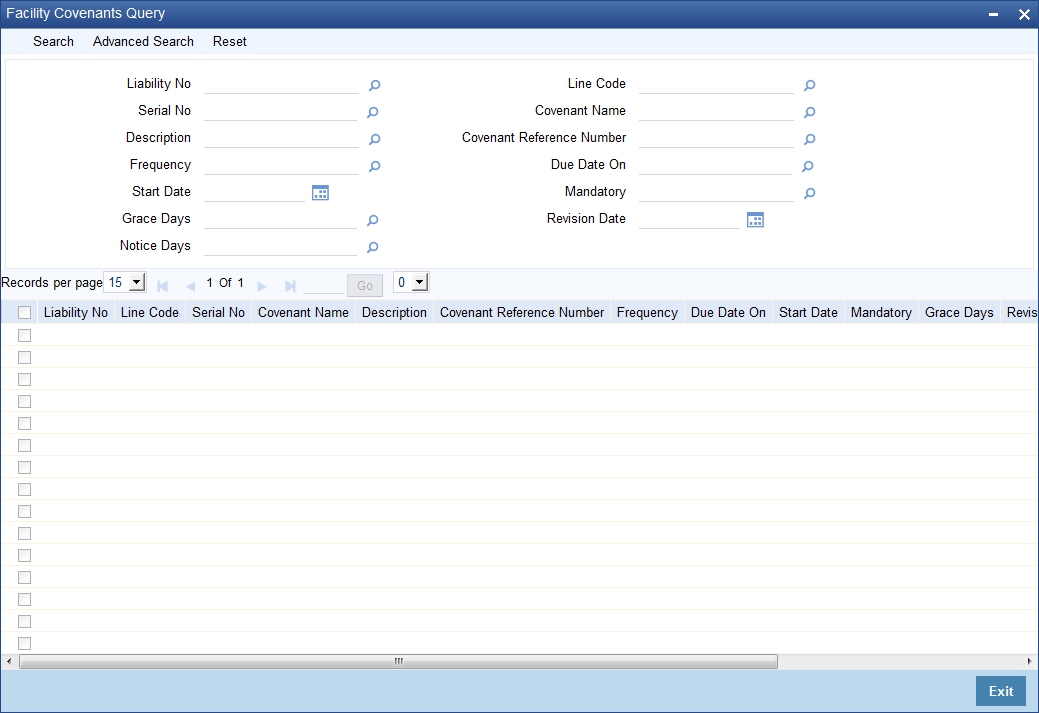 You can invoke the ‘Facility Covenants Query’ screen by typing ‘GESQFCNV’ in the field at the top right corner of the Application tool bar and clicking the adjoining arrow button.