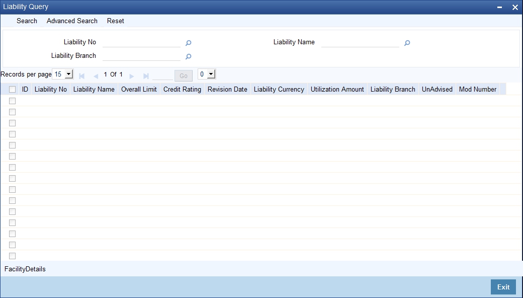 You can use this screen to query the Facilities and the Utilizations Details for a Liability. To do this, choose the liability for which you wish to view details by checking the box at the beginning of each row and clicking the ‘Facility Detail’ button. The ‘Facility Query’ screen with details of the facilities is displayed: