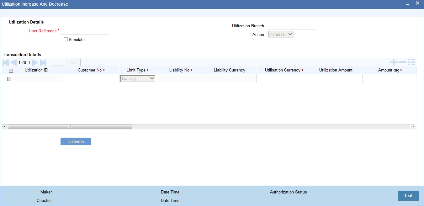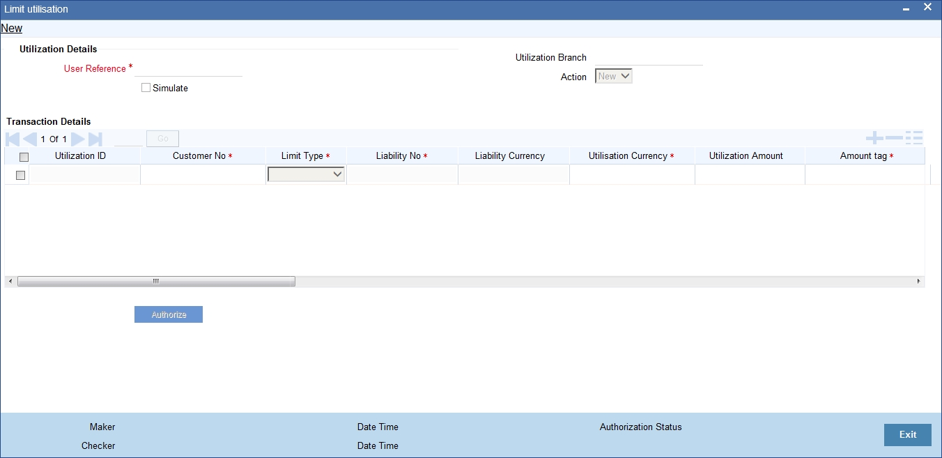 A New Utilization transaction can be entered as Authorized Online or Unauthorized. If the transaction is not authorized online, then Oracle FLEXCUBE ELCM provides the facility to authorize the inputted transaction.