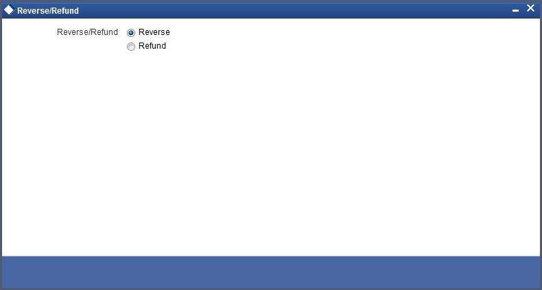 You can process a refund for a contract by using the ‘Reverse’ option from the Actions Menu, or click ‘Reverse’ icon in the toolbar. The ‘Reverse/Refund’ screen is displayed.