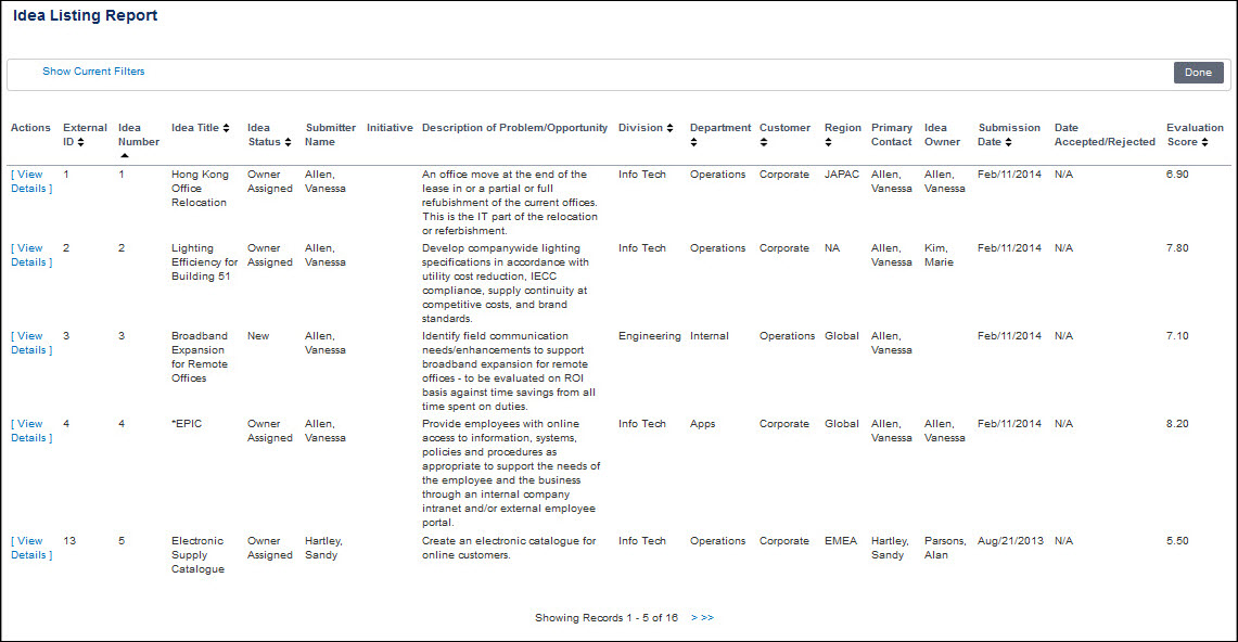 Based on your filters, this report displays all ideas in the system. Some of the columns that can display on your report include: idea number, title, status, submitter name, initiative, description of problem/opportunity, division, business unit, custom fields, primary contact, assignee, submission date, date accepted/rejected, and the evaluation score.