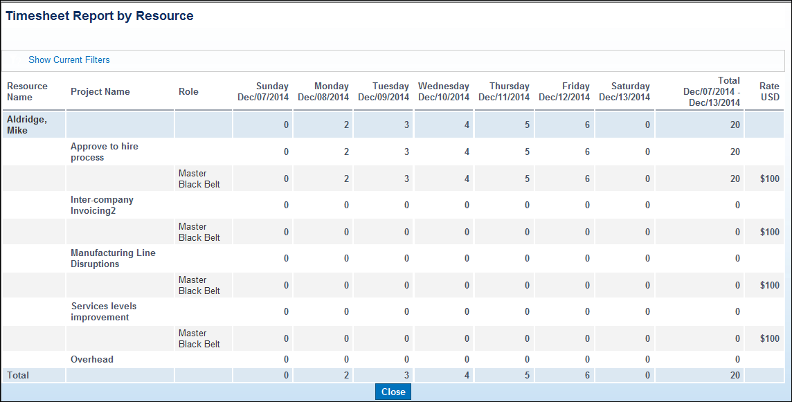 Based on your filters, this report displays timesheet report by resource. It shows the resource name, project name, role, activities, the number of hours reported on timesheet, total hours, rate, and cost. If you select to view non-project overhead categories, you can view the non-project time reporting categories and the non-working time reporting categories. This report include numbers only from active projects and not completed or closed projects.