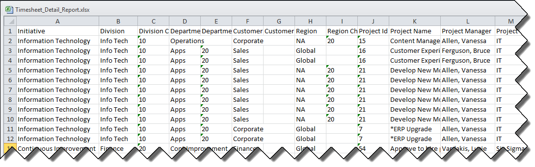 This is a detailed report of timesheets. You can export the data generated by this report to Microsoft Excel to view the Plan versus Actual data and the cost across various dimensions. You can use Excel to format the data, group rows and columns, aggregate by quarters, years, or by fiscal period.