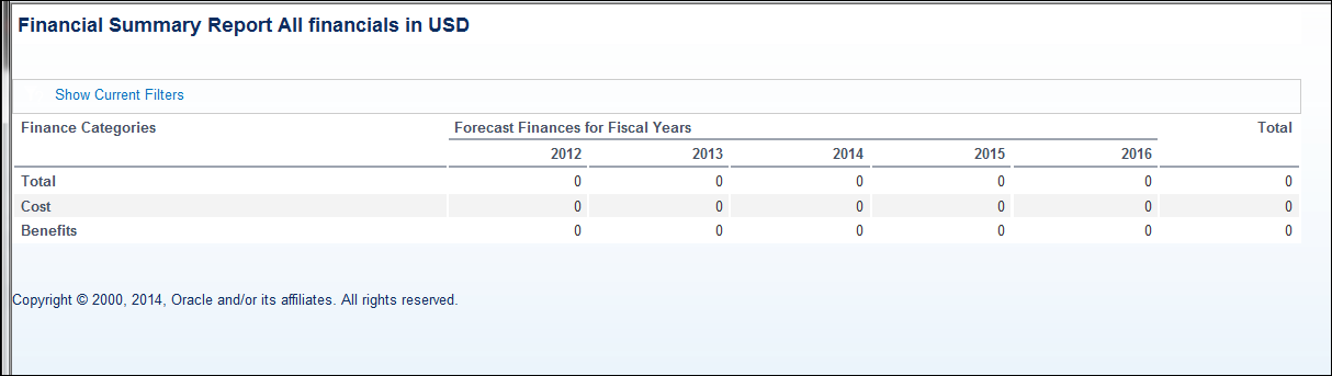 This report displays the finance summary using the specified filter and output parameters. This report aggregates planed or actual finances by Group, Category, or Element for each fiscal year for all projects based on your filters. Before running this report, you must choose a Finance Template, Finance View, and a Finance Type.