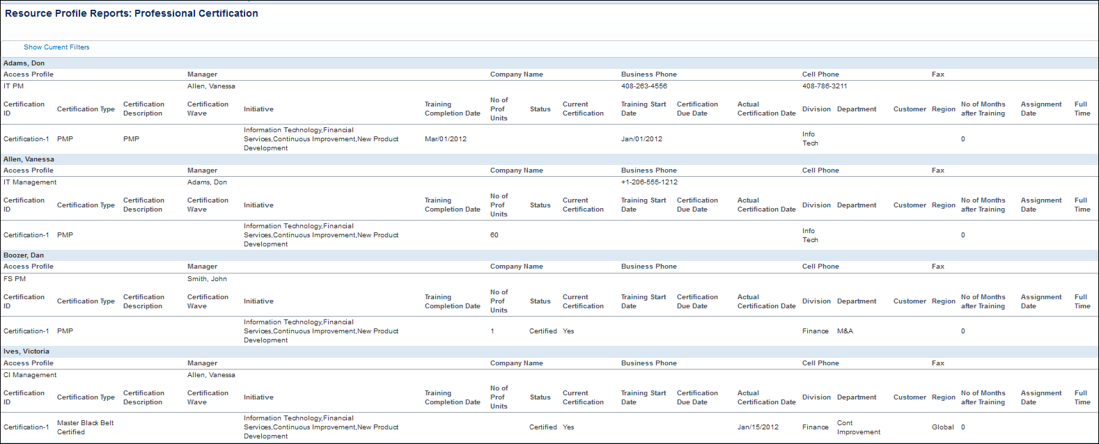You can filter on pull down status, initiative, resource basics, and organization hierarchy.