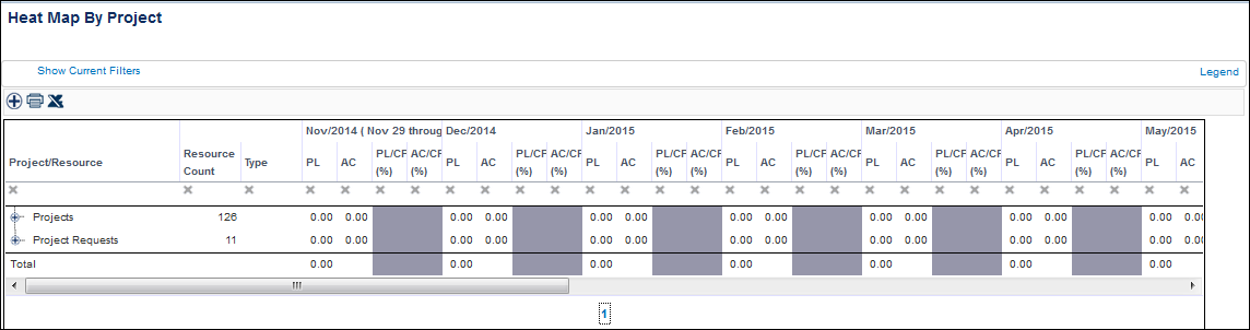 Based on your filters, this report displays a heat map by project. It displays the project/resource, resource count, planned effort for resources (PL), actual effort for resource (AC), planned utilization (PL/CP %), and the actual utilization (AC/CP %). For more information on the heat map thresholds used and a description of the column headers, click the Legend link. If your report has a cell highlighted in orange, it indicates that the committed effort as a percentage of capacity for the activity is in the mid range. If a cell is highlighted in red, it indicates that the activity's planned utilization is very high, and cells highlighted in green indicate very low utilization.
