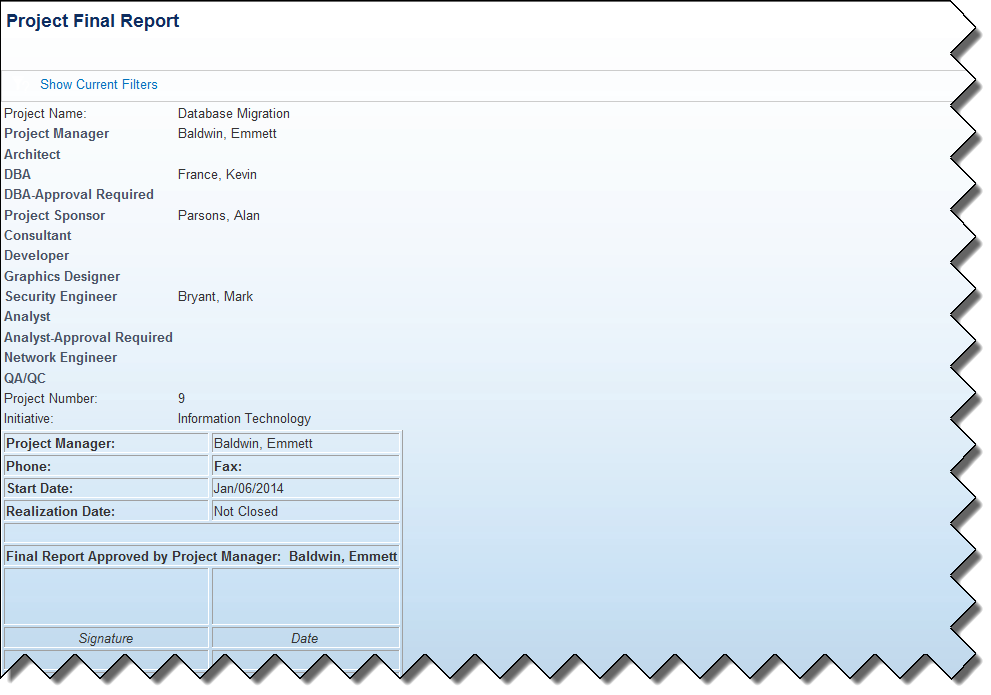 Based on your filters, this report displays the project final report. It displays the project definition, project summary, project details, stage conclusions, team members, control plan tasks, project documentation, and custom fields.