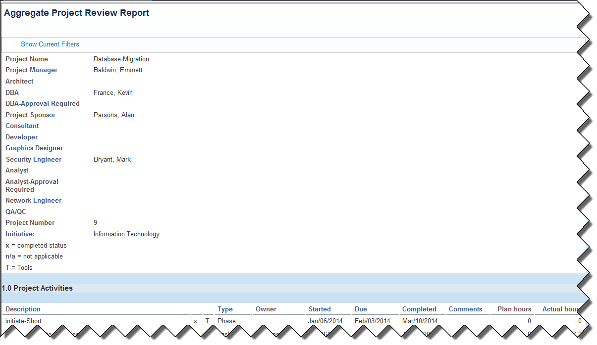 Based on your filters, this report displays the aggregate project review report. It displays the project name, project activities, analysis tools, issues, and custom fields.