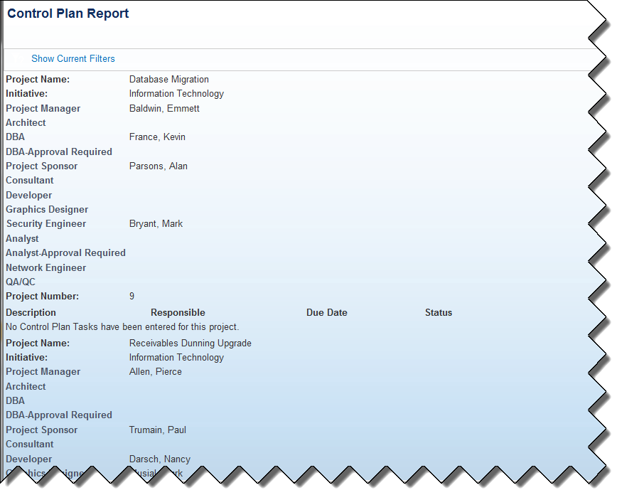 You can filter on pull-down status, initiative, project basics, organization hierarchy, and project custom fields, classification fields.