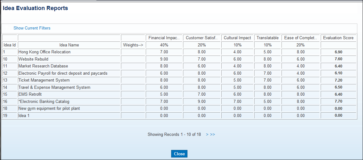 Based on your filters, this report displays the evaluation of all ideas in the system.