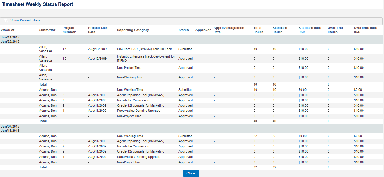 Based on your filters, this timesheet report shows status and approval information for each category (project, non-project, and non-working) along with cost details for each resource by week. It shows the week range, submitter, project number, project start date, reporting category, status, approver, approval date, total hours, standard hours, standard rate, overtime hours, and overtime rate.