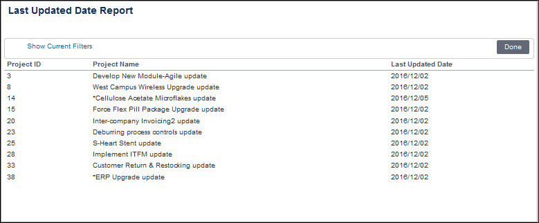 Use the Last Modified Date report to display a list of entities (project, finance, activity, team, and snapshot) that were updated on or after the selected date. For example, if you select Finance, all projects that had finances updated on or before the last updated date are displayed.