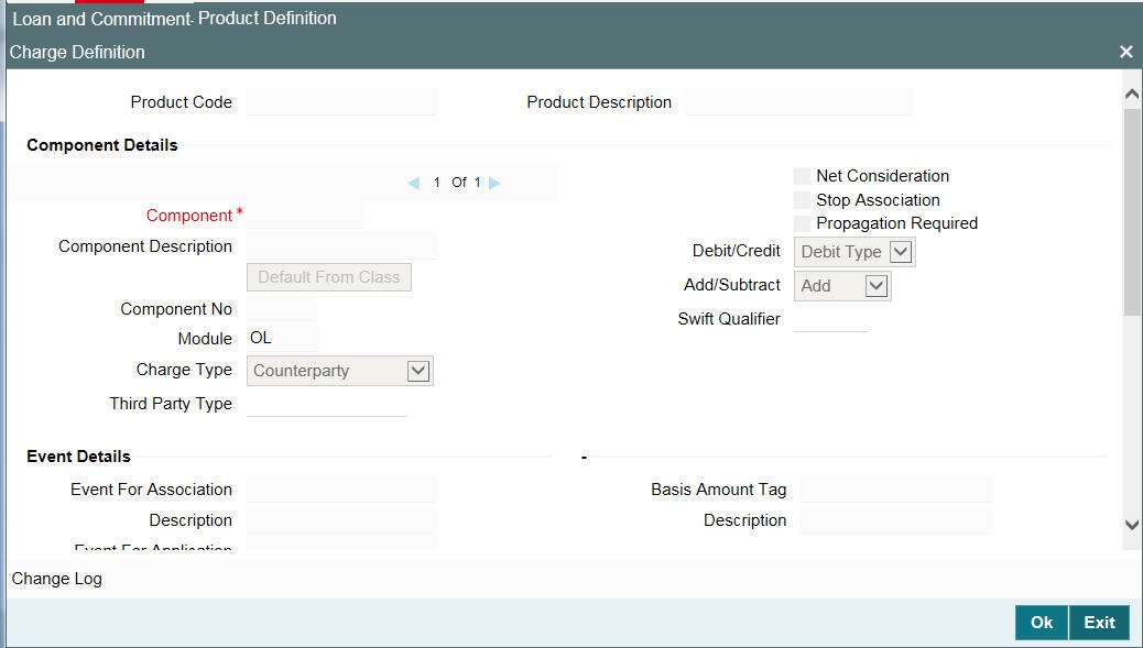 You can specify the charge components applicable to a product, in the Charge Definition sub- screen of ‘Loans and Commitment Product Definition’ screen. Click ‘Charges’ from ‘Loans and Commitment Product Definition’ screen to invoke the ‘Charge Definition’ sub-screen.