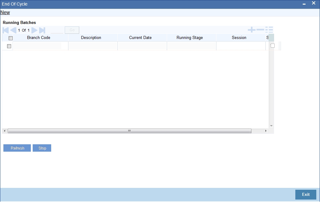 The system displays the running branches on this screen. Check the box under ‘Stop’, against the branches for which you wish to stop the process. Click ‘Stop’ button to stop the process for the selected branches.
