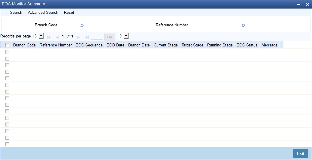 On this screen, you can search for the EOC processes that are currently running. Specify the branch code or the EOC Reference number and click ’Search’ button. Based on the filters that you have set, the system displays the details of the EOC processes.