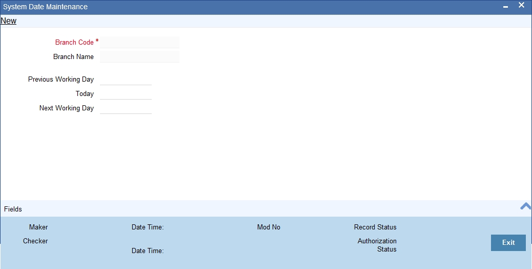 The only time you add a record in the system dates table is when Oracle FLEXCUBE is first installed in your branch. Subsequently, the dates will be updated by EOD operations.Click ‘Exit’ button to exit the screen. You will be returned to the Application Browser.