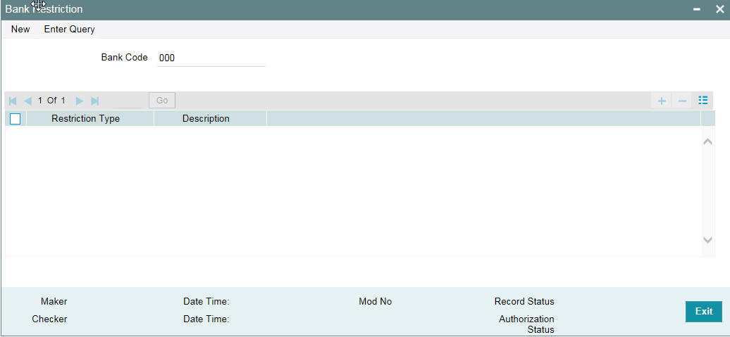 To invoke the ‘Bank Restrictions’ screen, by typing ‘SMDBNKRT’ in the field at the top right corner of the Application tool bar and clicking on the adjoining arrow button.