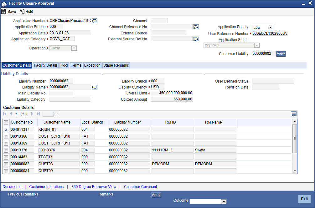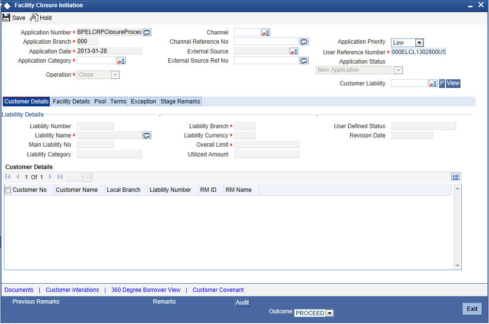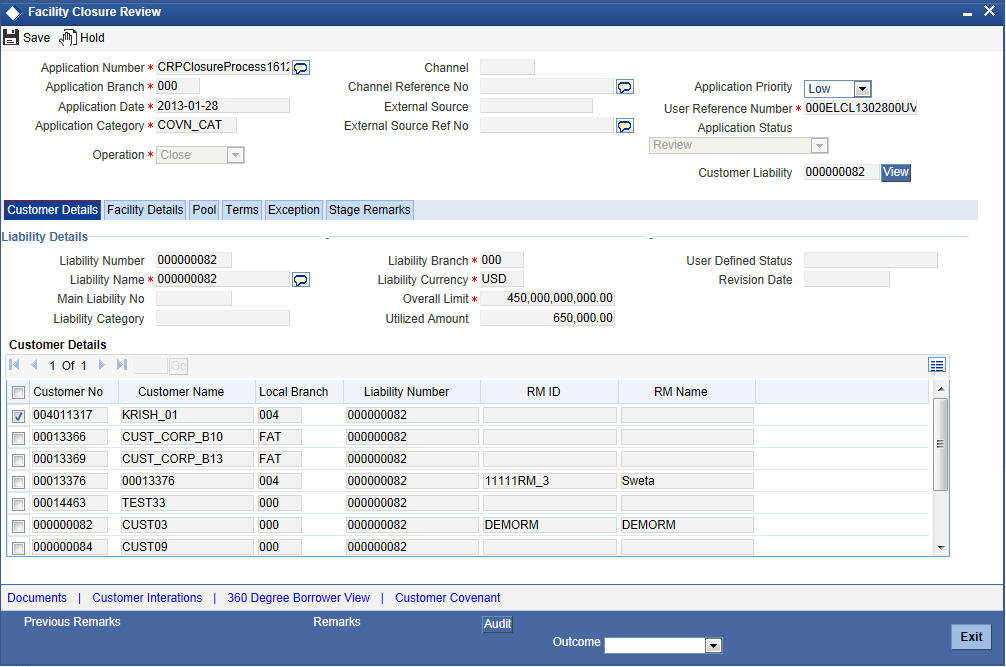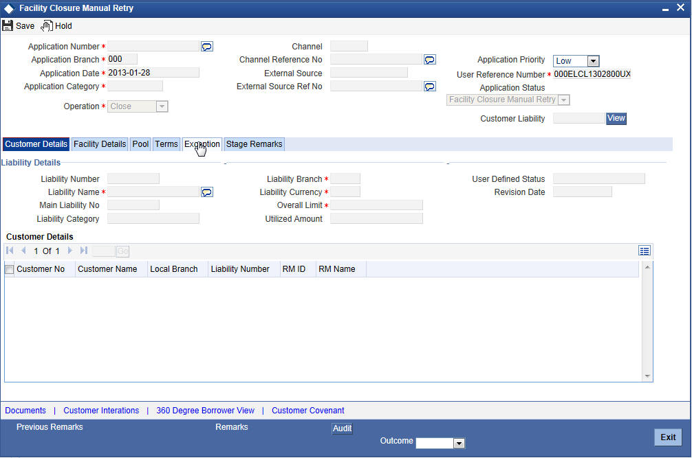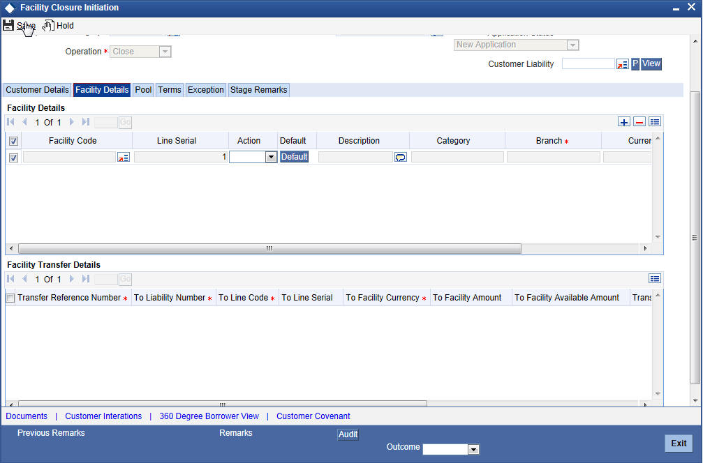 You can close the existing facility (select Operation as ‘Closure’) The system will pull out the customer details, facility details, liability details from Oracle FLEXCUBE based on the selected liability no, facility no.