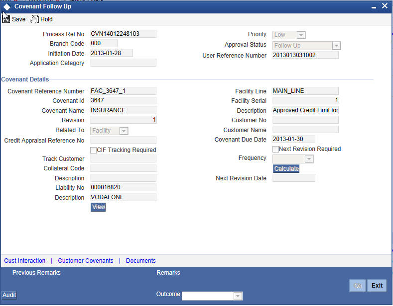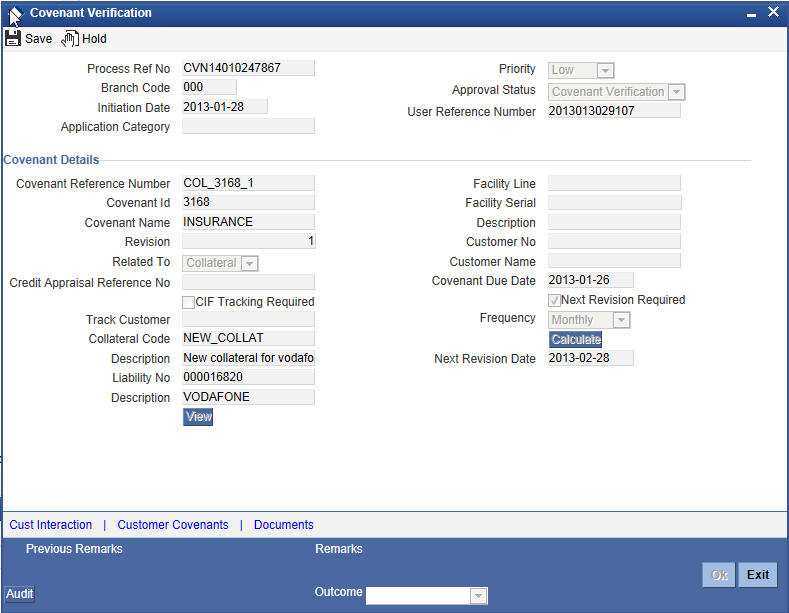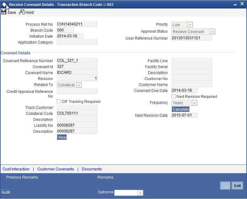 In this stage, the bank receives an application covenant details which will be tracked in the process. Facility will be provided to view the interaction which has been carried out with the customers and list of covenants which are pending / received from the customer.