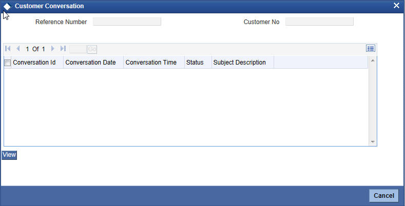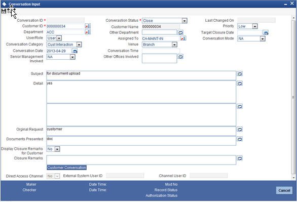 You can view the conversation information for the selected conversation id through ‘Conversation Input’ screen. To invoke this screen click ‘View’ button in the ‘Customer Conversation’ screen.