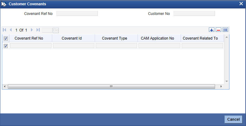 You view the covenants which has been received or pending to receive from the customers through ‘Customer Covenant’ screen.To invoke this screen click ‘Customer Covenants’ button in ‘Receive Covenant Details’ screen.