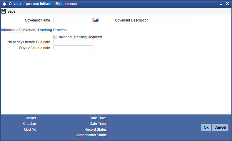 In this stage, the bank receives an application covenant details which will be tracked in the process. Facility will be provided to view the interaction which has been carried out with the customers and list of covenants which are pending / received from the customer. To capture the no of days before the covenant task needs to be created from the due date / revision date.