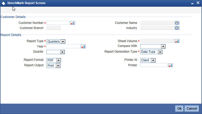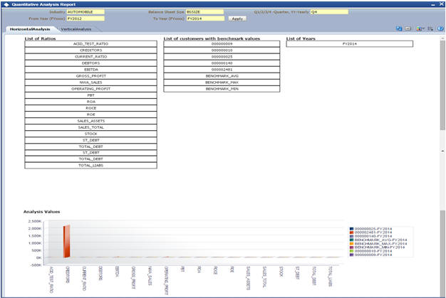You can compare the financial ratios with predefined benchmark ratios using ‘Benchmark Report Screen’ screen. The system will allow you to select the customer number, financial year and the type of the comparison like compare with Quarter1/Quarter2/Quarter3/Quater4/Last year etc.