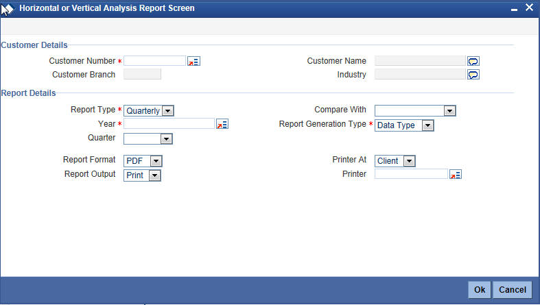 You can compare the financial ratios with previous Quarter / year using ‘Horizontal or Vertical Analysis Report’ screen. The system will allow you to select the customer no, financial year, Quarter / Year and the type of the comparison like compare with previous quarter, last year quarter and previous year.