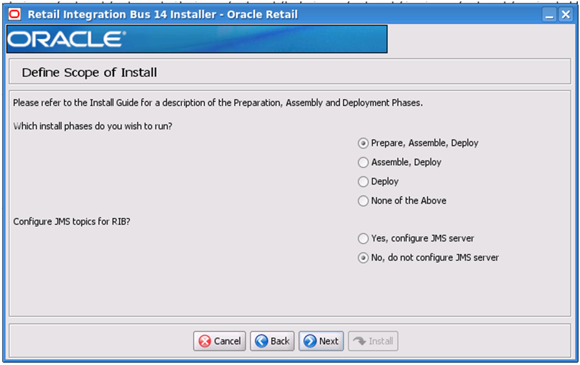Field Description | Used by the installer's build.xml to determine whether to configure the JMS topics.Will run the command-line tool:rib-app-deployer.sh -prepare-jms |