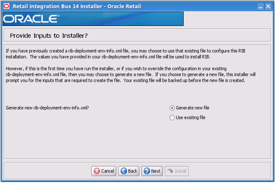 Field Description | Used by the installer to determine whether to prompt user for inputs needed to generate the rib-deployment-env-info.xml file. Also used by the installer's build.xml to determine whether or not to actually generate the new file. |
